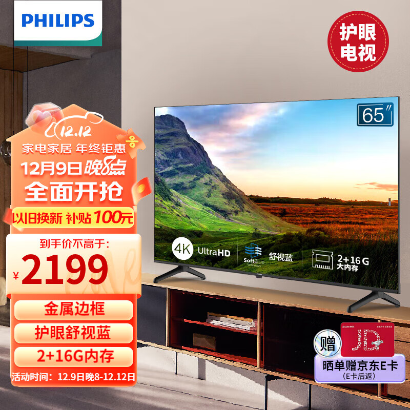 飞利浦(PHILIPS)电视65英寸 儿童护眼抗蓝光 客厅卧室电视机 金属边框 屏4K超高清液晶电视机 以旧换新 2+16G 65PUF7128/T3价格:2249.00元!