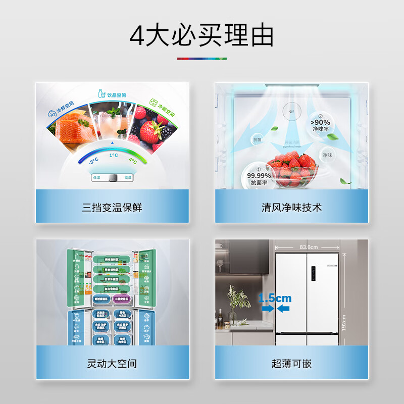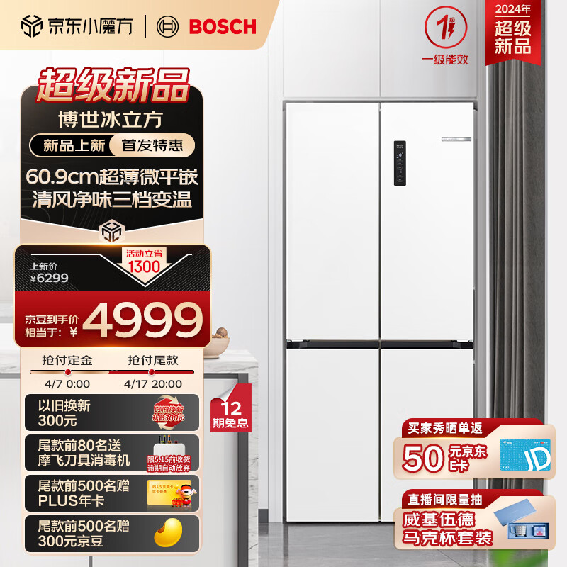 博世(BOSCH)【冰立方】497升十字对开四门超薄微平嵌入式冰箱60.9cm净味变温一级能效白色K1EC49208C超大容量价格:5799.00元!
