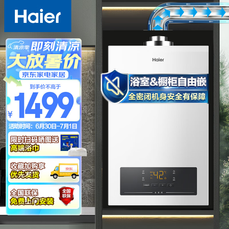 海尔(Haier)13升燃气热水器天然气 平衡式 室内精控恒温 智能变升浴室安装 JSG25-13ZH3(12T)【以旧换新】价格:1599.00元!