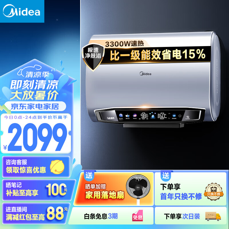 美的(Midea)60升玲珑超薄双胆扁桶电热水器3300W变频 镁棒免换12倍增容一级能效F6032-UD京东小家以旧换新价格:2299.00元!