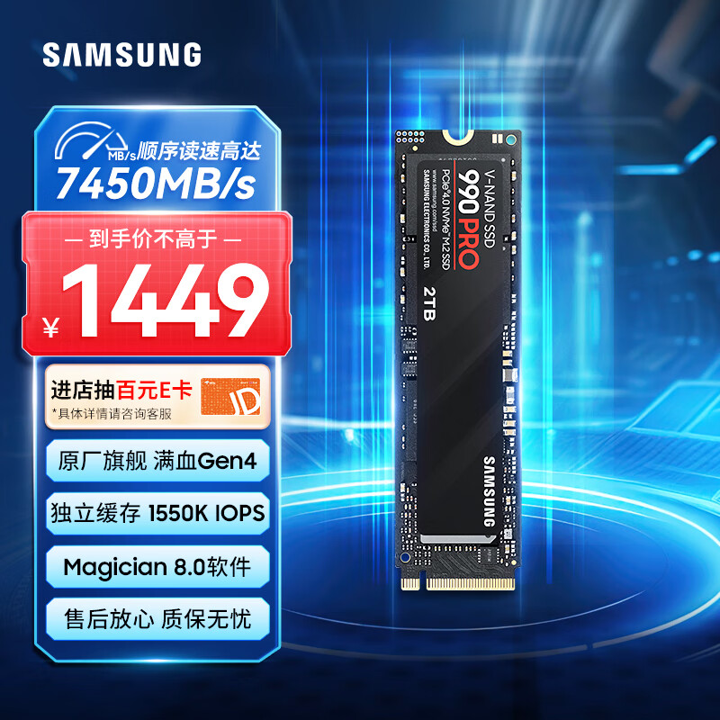 三星(SAMSUNG)2TB SSD固态硬盘 M.2接口(NVMe协议PCIe 4.0 x4) AI电脑配件 读速7450MB/S 990 PRO价格:1449.00元!