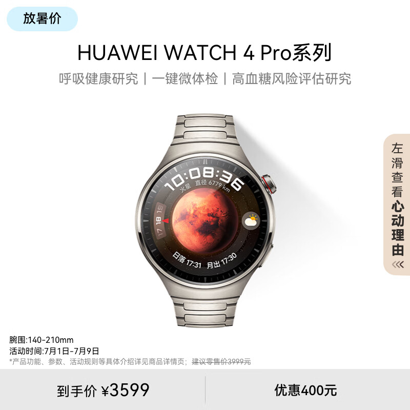 华为【送礼送健康】WATCH 4 Pro华为手表智能手表呼吸健康研究华为运动手表一键微体检火星钛表盘价格:3599.00元!