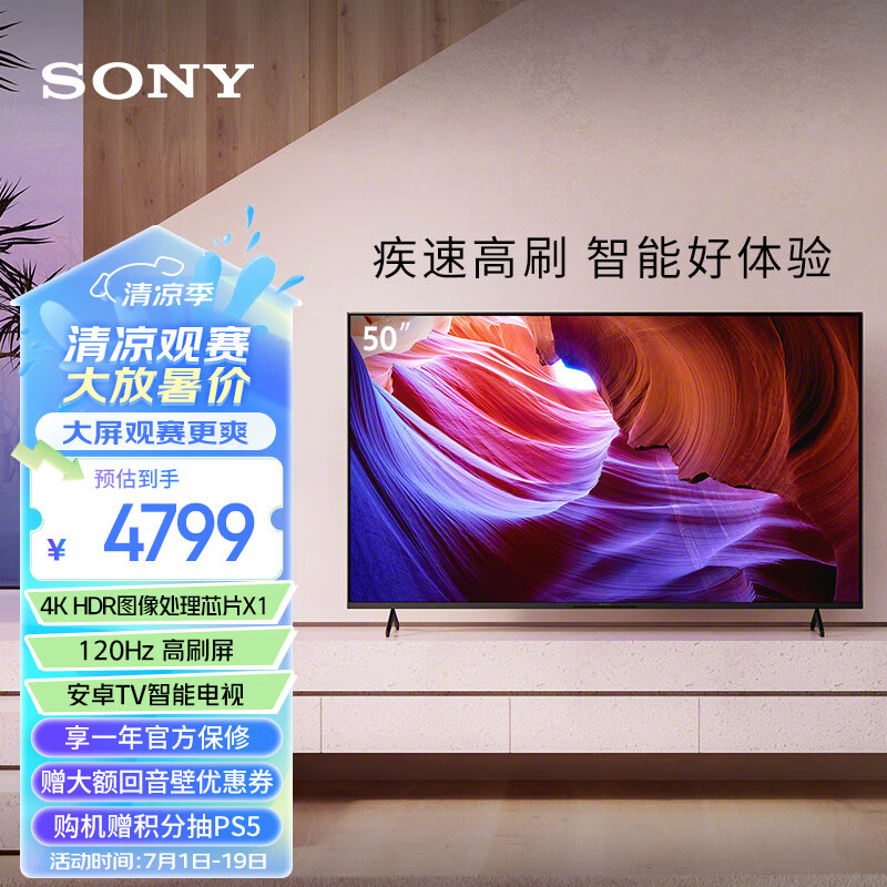 索尼(SONY)【官方直营】KD-50x85K 50英寸 4K HDR 屏智能电视 广色域 120Hz高刷 X1芯片 京配上门价格:4799.00元!