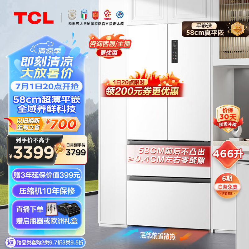 TCL 466升T9超薄平嵌法式四开门58cm嵌入式白色家用电冰箱风冷无霜一级能效大容量双循环R466T9-DQ价格:3899.00元!