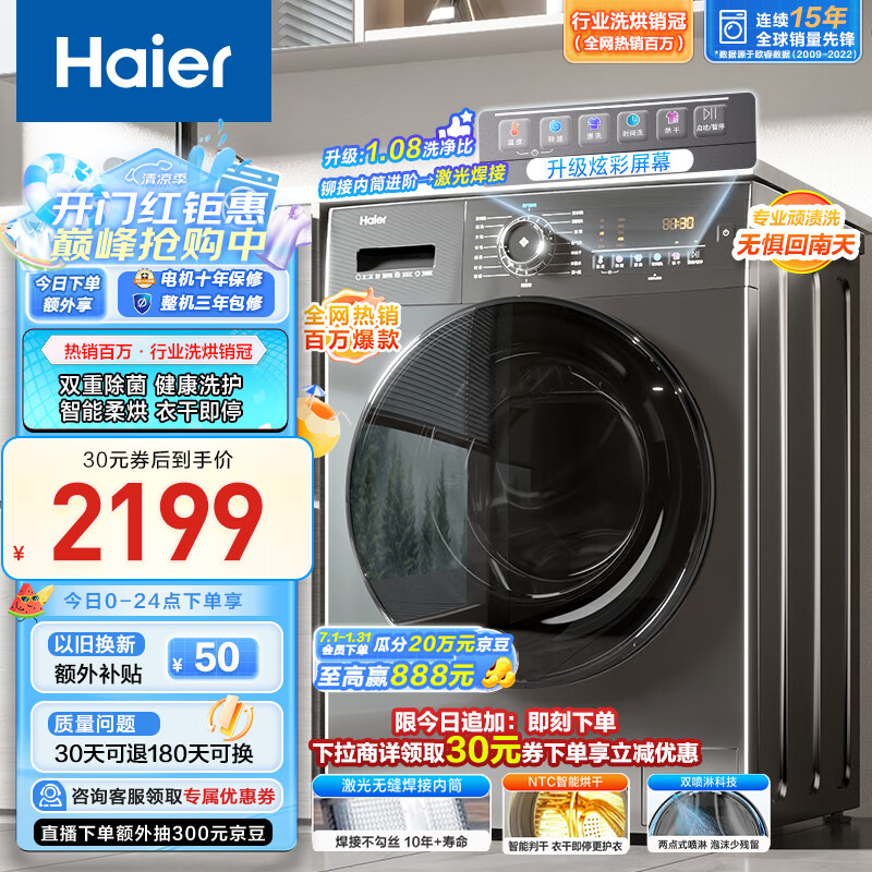海尔(Haier)滚筒洗衣机全自动 洗烘一体机超薄家用 10公斤大容量带烘干【EG100HMATE28S】排名前10名 以旧换新价格:2229.00元!