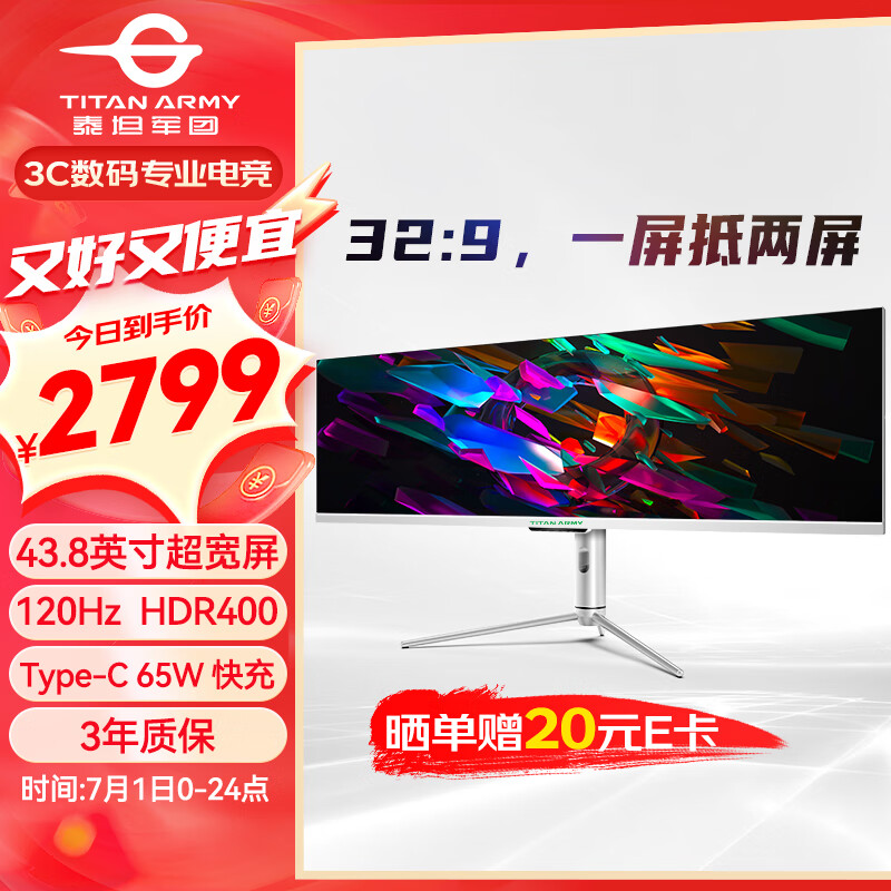 泰坦军团43.8英寸 32:9 IPS超宽屏 120Hz HDR400广色域 Type-C 65W快充 剪辑设计股票分屏电脑显示器P43UGD价格:3499.00元!