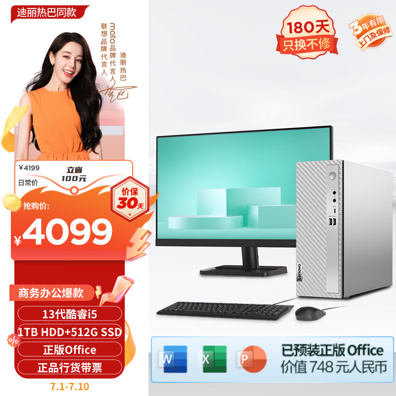 联想(Lenovo)天逸510S商务办公台式机电脑主机(酷睿13代i5-13400 16G 1TB HDD+512G SSD win11)23英寸显示器价格:4099.00元!
