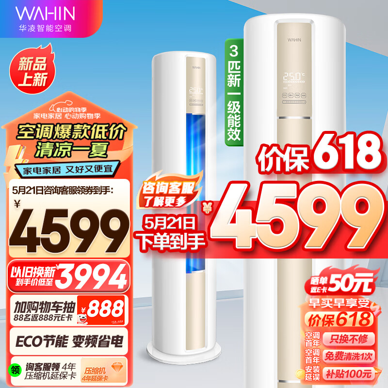 华凌空调 3匹 柜机新一级能效 空调立式 客厅柜式空调柜机 KFR-72LW/N8JD1价格:4599.00元!