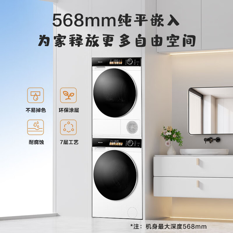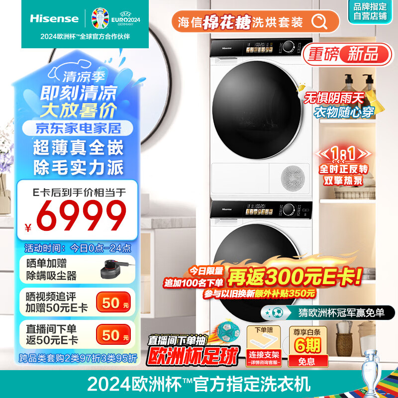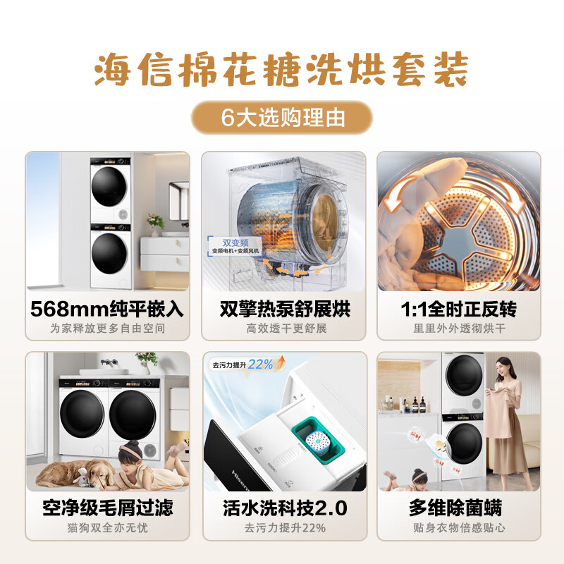海信(Hisense)棉花糖洗烘套装 10公斤滚筒洗衣机全自动+双擎热泵烘干机 1:1正反转 超薄平嵌 WG100M5S+DG100M5S价格:7299.00元!