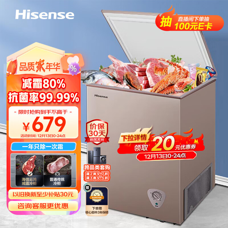 海信(Hisense)100升低霜家用小冰柜 一级能效冷藏柜冷冻柜 顶开门单温母婴母乳小冰箱BD/BC-100NUD以旧换新价格:699.00元!
