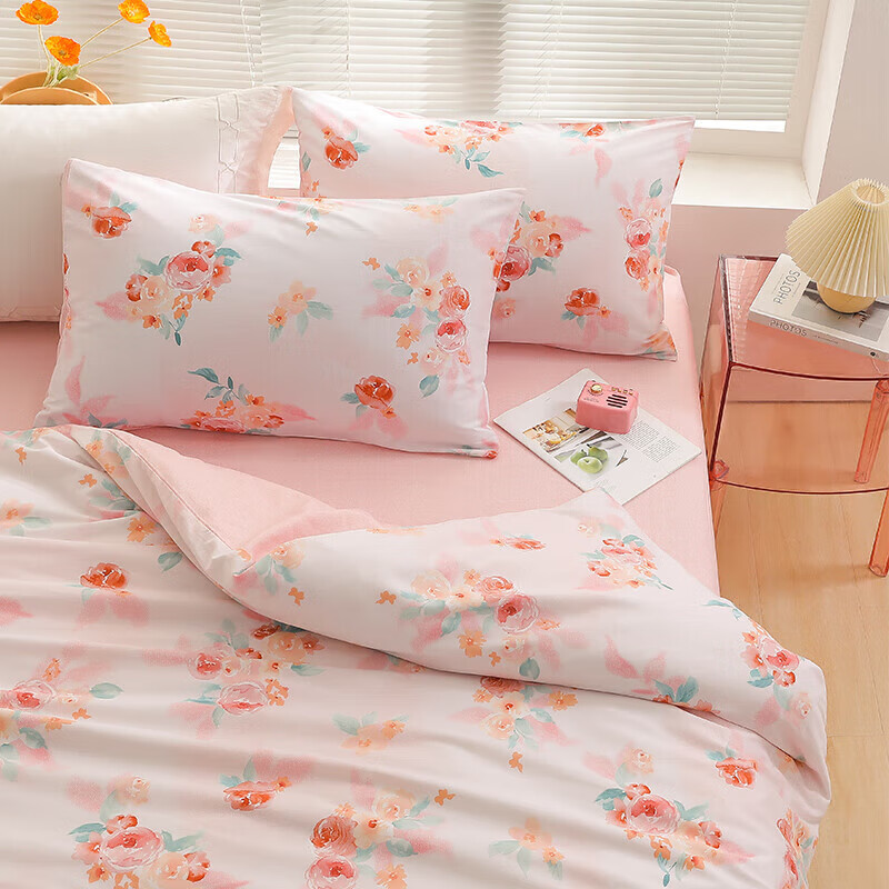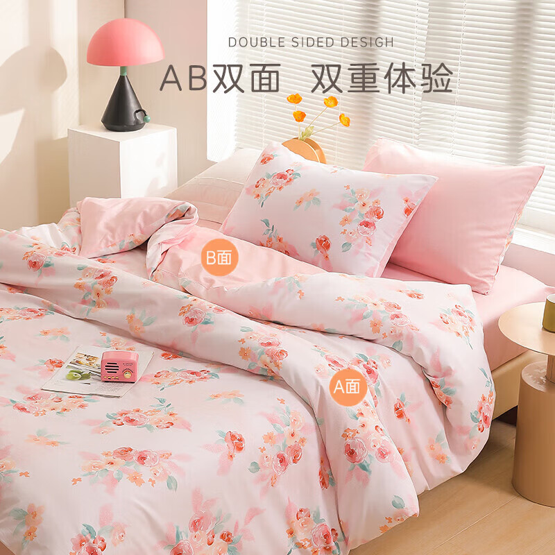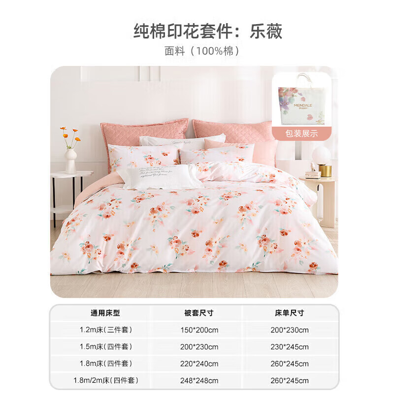 1、梦洁这套纯棉印花四件套是在促销时候买的,价格还挺合适的,花纹也特别有春天的感觉,棉质也很好