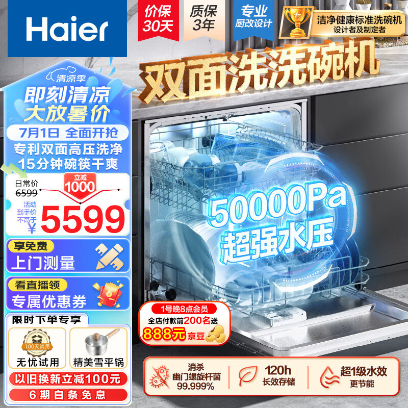 海尔(Haier)15套嵌入式双面洗洗碗机W50变频双一级水效 三重洁净 智能开门速干EYBW152266CWU1价格:5599.00元!
