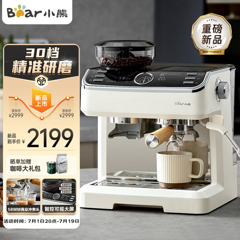 小熊(Bear)咖啡机 意式半自动家用咖啡机 研磨一体机 现磨咖啡豆手动奶泡 KFJ-E28A5端午送礼价格:2499.00元!