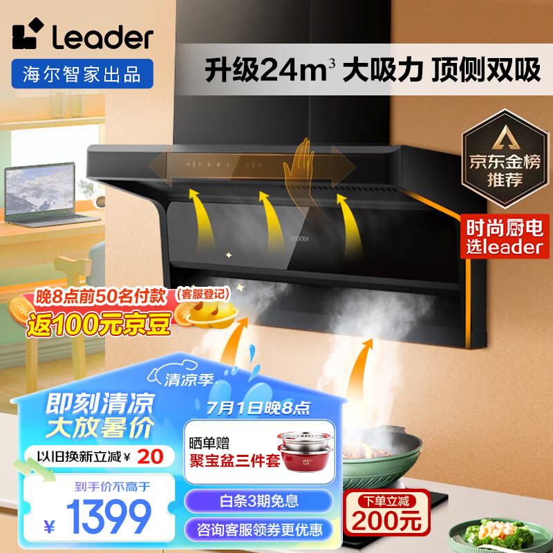 海尔(Haier)智家出品油烟机 抽油烟机顶侧双吸 升级24风量大吸力 leader 三腔速吸挥手 自清洁 以旧换新IQ92D价格:1599.00元!