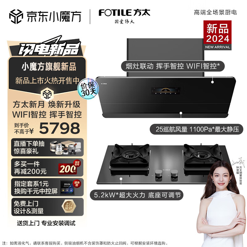 方太(FOTILE)新月F1S系列抽吸油烟机灶具侧吸套餐变频25巡航风量5.2kW可调节大火灶F1S+02-TH27B天然气价格:5798.00元!