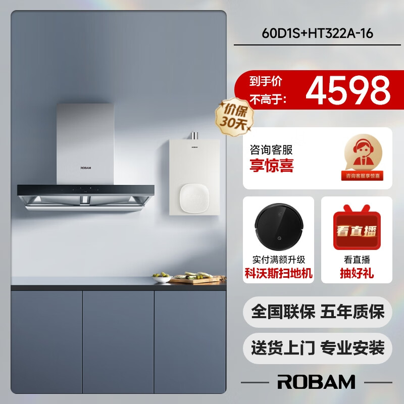 老板(Robam)厨房多件套 欧式双腔变频22风量吸油烟机家用大吸力 16升恒温燃气热水器天然气60D1S+HT322A-16价格:4898.00元!