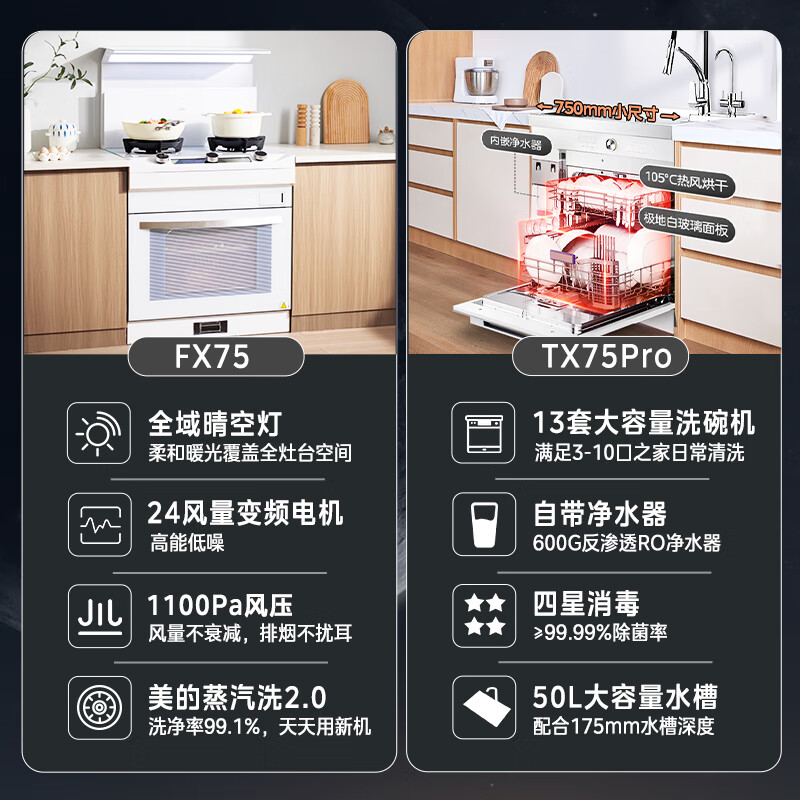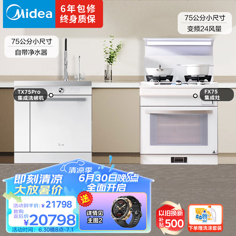 美的(Midea)集成灶FX75+集成水槽洗碗机TX75Pro【小尺寸白色套装】油烟机燃气灶蒸烤箱 13套洗碗机自带净水器价格:21798.00元!