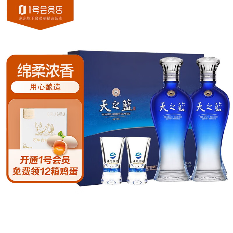 洋河天之蓝 绵柔浓香型高度白酒 52度 480ml*2瓶 礼盒装 1号会员店价格:579.00元!