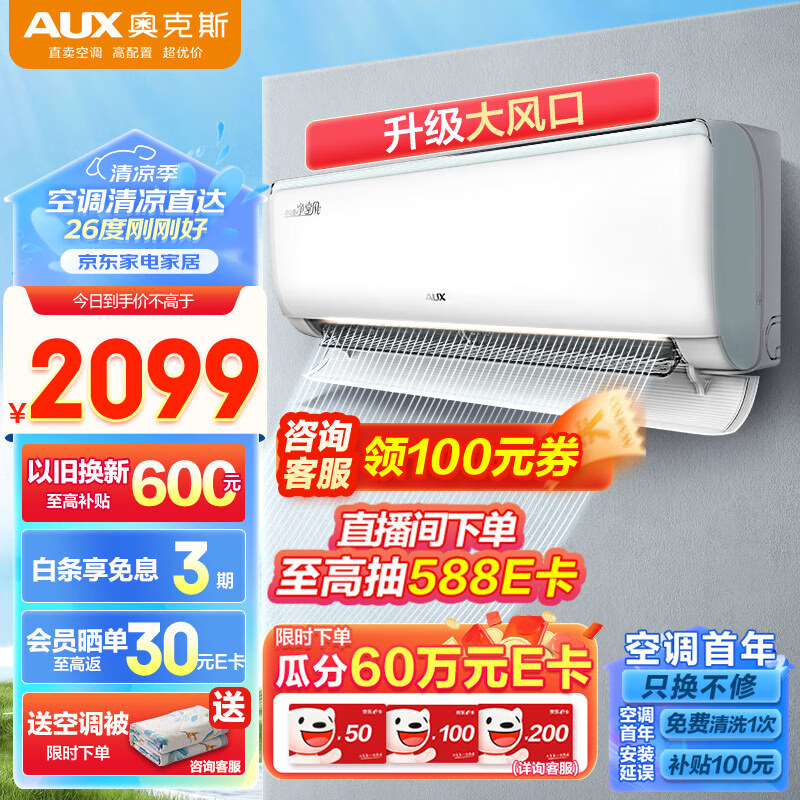 奥克斯(AUX)1.5匹空调 净享风 新1级能效 一键舒风 ?高频速冷暖 易拆滤网(KFR-35GW/BpR3DQB1(B1))空调挂机价格:2099.00元!