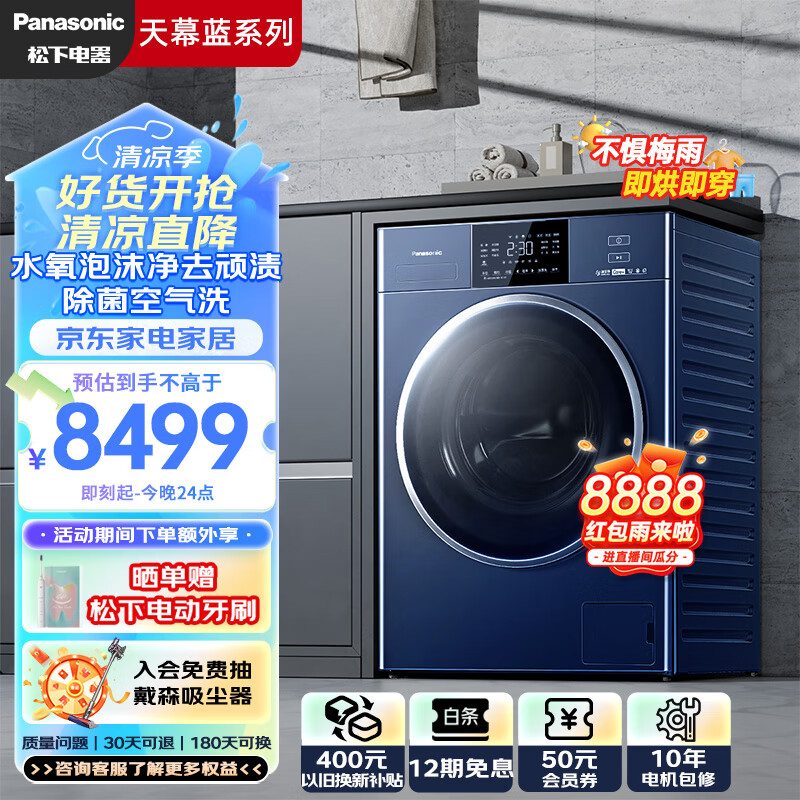 松下(Panasonic)滚筒洗衣机超薄全自动 洗烘一体机12公斤 天幕蓝 水氧泡沫净祛顽渍 除菌空气洗大容量XQG120-EG215价格:8499.00元!