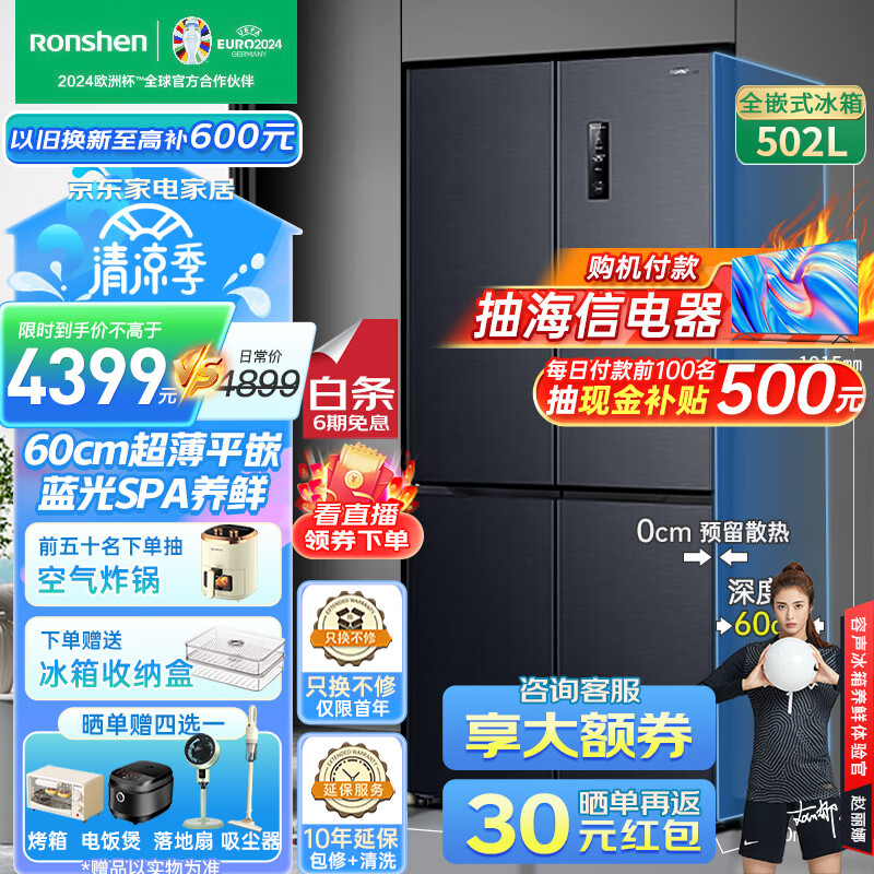 容声冰箱十字对开门502升家用大容量超薄零距离嵌入式一级变频节能无霜冰箱BCD-502WD1FPQ[官方直发]价格:4399.00元!