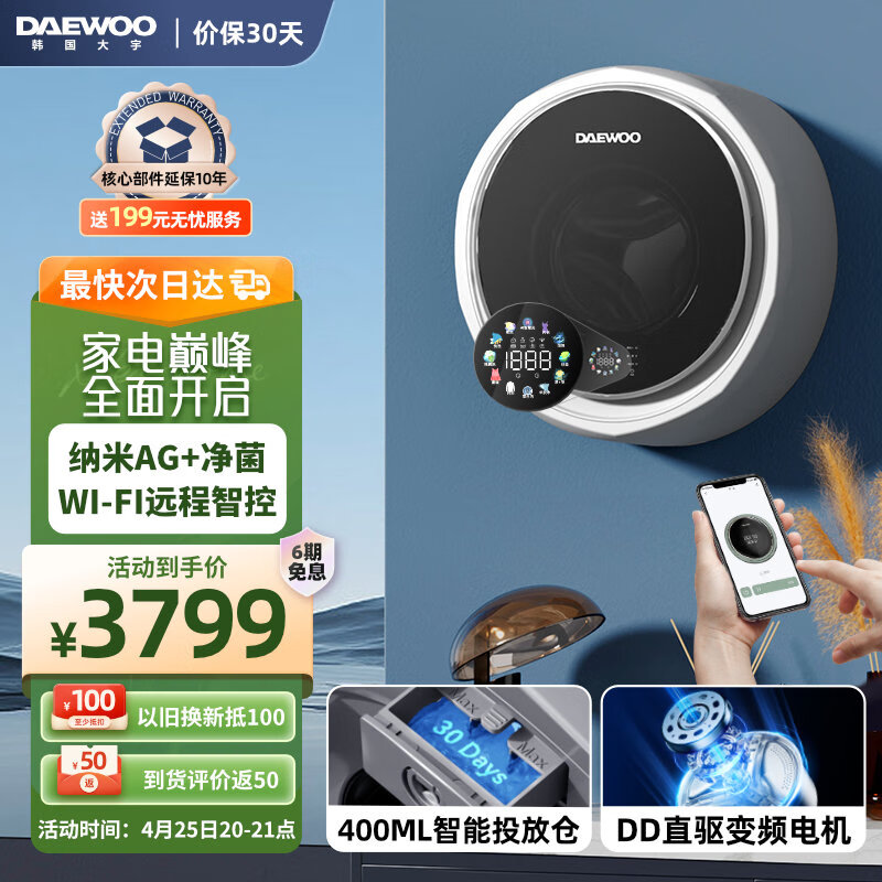 大宇(DAEWOO)壁挂洗衣机 全自动变频3KG滚筒 彩屏WiFi智联 高温煮洗 升级款星云系列 DY-BGX07 皎月白价格:3999.00元!