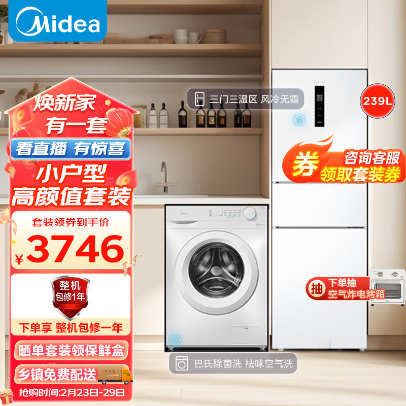 美的(Midea)小户型冰洗套装 三门一级风冷无霜租房宿舍小冰箱MR-251WTPE+10公斤滚筒全自动洗烘一体MD100V11F价格:3943.00元!