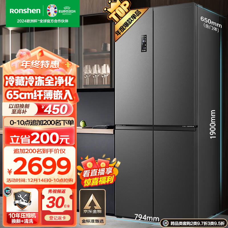 容声(Ronshen)离子净味465升十字对开四开门冰箱家用超薄可嵌入式变频一级能效无霜BCD-465WD18FP大容量价格:2899.00元!