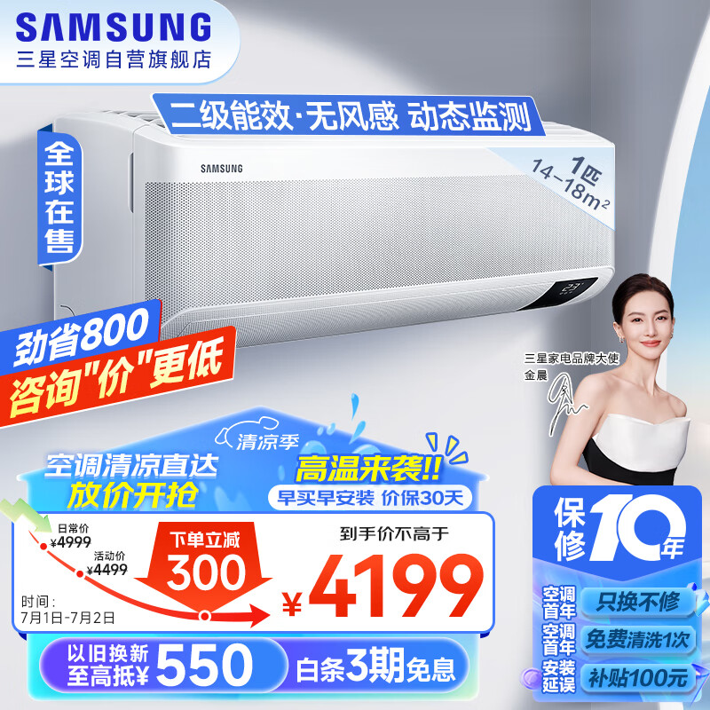 三星空调1匹新二级能效全直流变频无风感WIFI除菌冷暖壁挂式挂机14-18㎡适用以旧换新AR09TSCAAWKNSC价格:4499.00元!