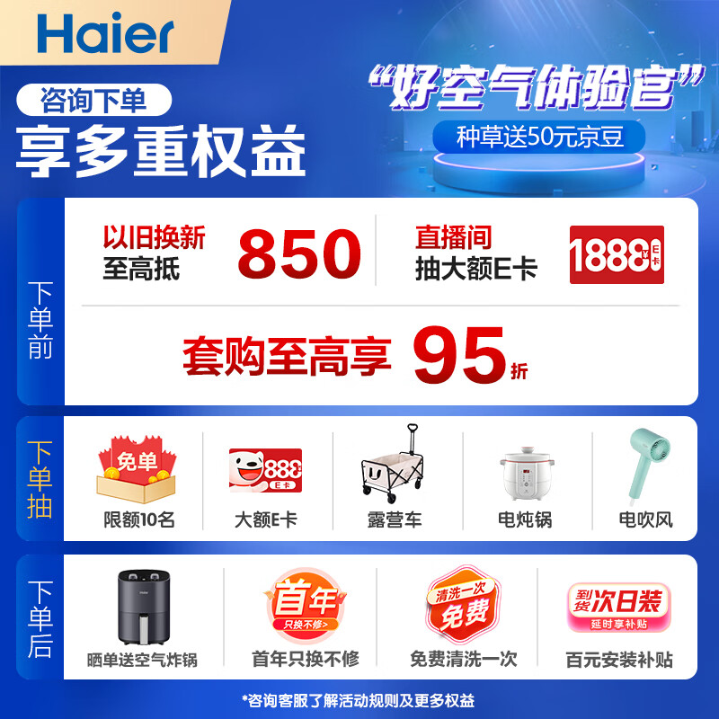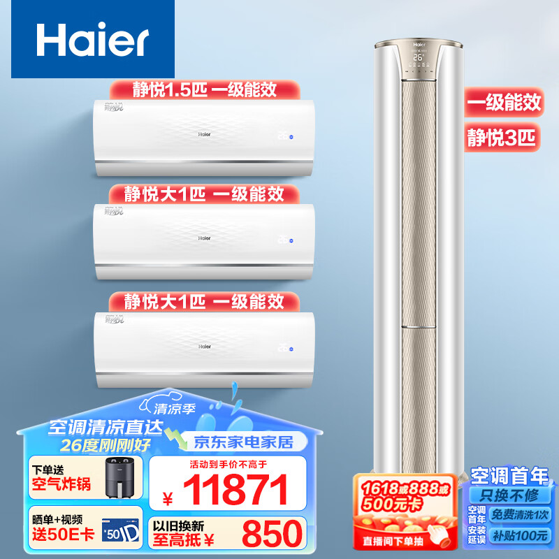 海尔(Haier)空调 新一级能效省电套装三室一厅(大1匹一级挂机*2+1.5匹一级挂机+3匹一级能效柜机)价格:11871.00元!