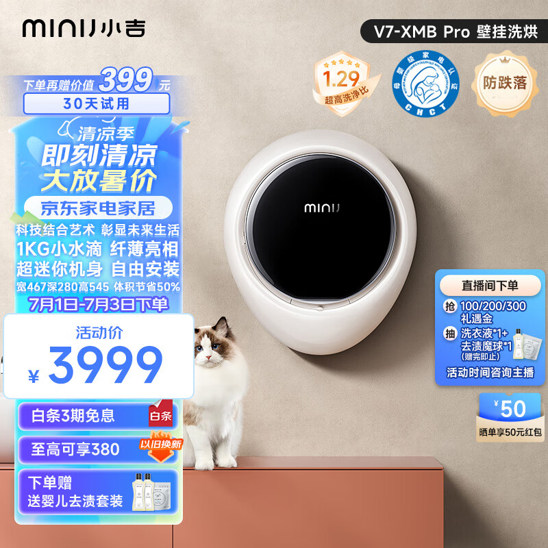 小吉(MINIJ)智控壁挂洗烘一体洗衣机 APP操控全自动智能变频 1kg迷你母婴洗衣机 小水滴 V7-XMB pro价格:3999.00元!