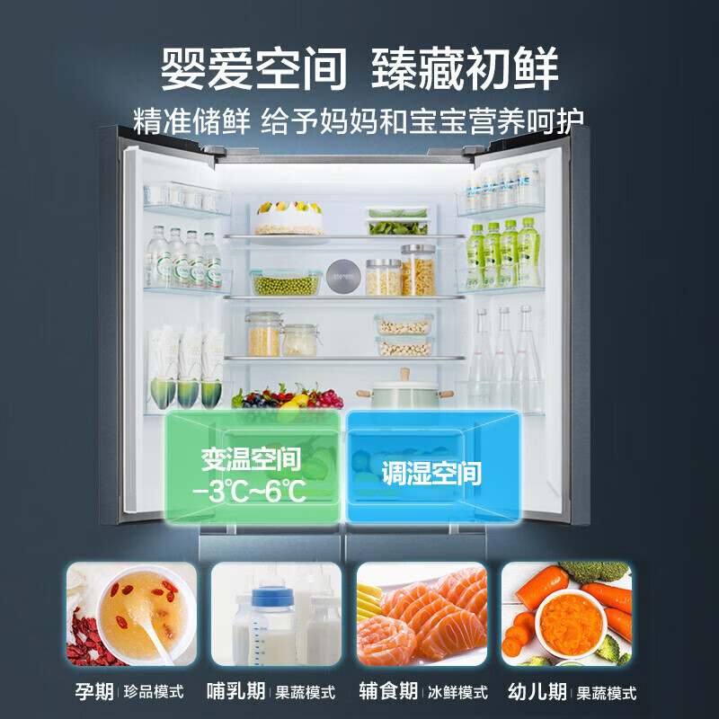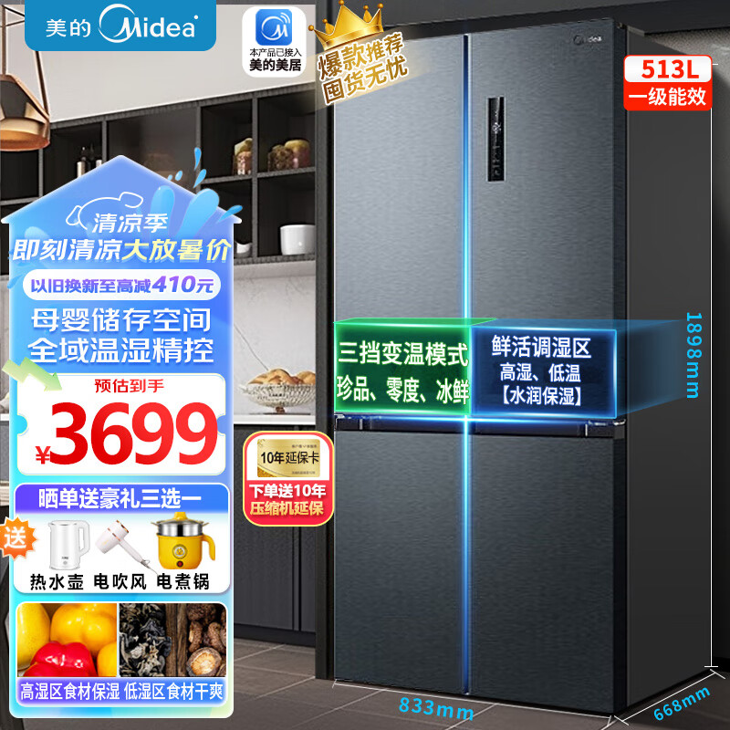 美的(Midea)【母婴空间】513升大容量变频一级能效十字双对开门四开门家用冰箱果润精储 BCD-513WTPZM(E)价格:3994.00元!