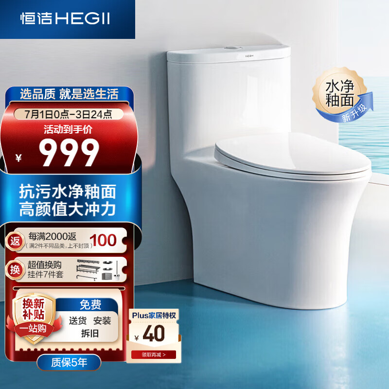 恒洁(HEGII)马桶506 水净釉面家用大冲力虹吸式坐便器HC0506PT-305价格:1099.00元!