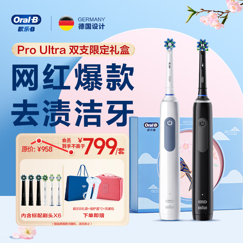 欧乐B成人电动牙刷Pro4Ultra双支甄选礼盒Pro系列3D声波圆头深度清洁牙龈按摩送男友送女友送礼生日礼物价格:859.00元!