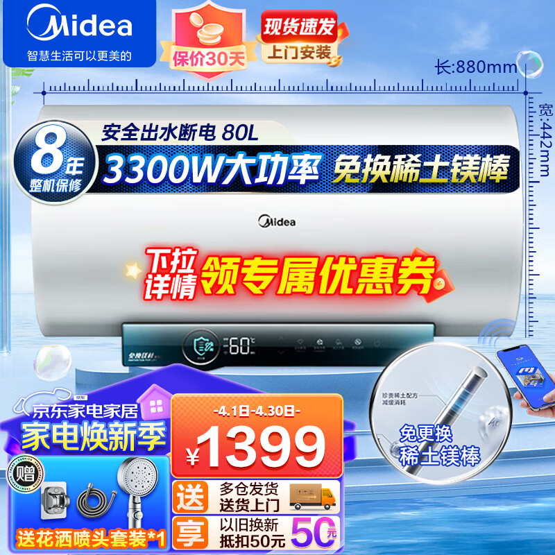 美的(Midea)储水式电热水器一级能效省电出水断电终身免换镁棒3300W速热加长防电墙F8032-JA5(HE)价格:1399.00元!