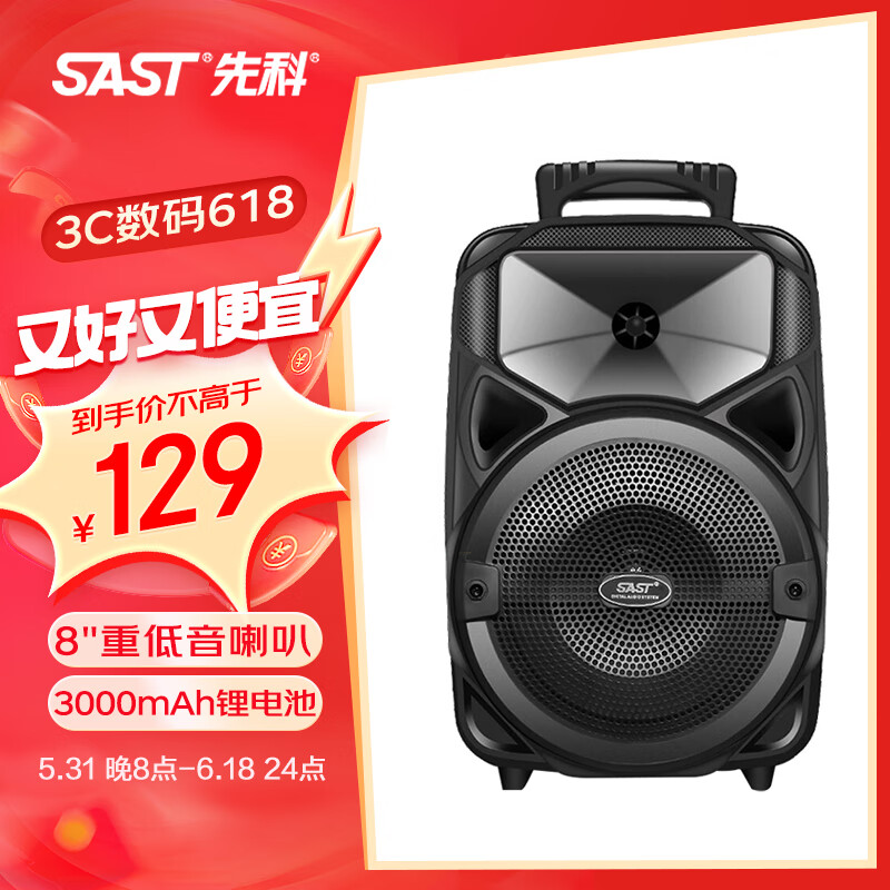 先科A57 8英寸广场舞音响户外大功率移动拉杆音箱无线蓝牙大音量K歌专用便携式无话筒麦克风版价格:129.00元!