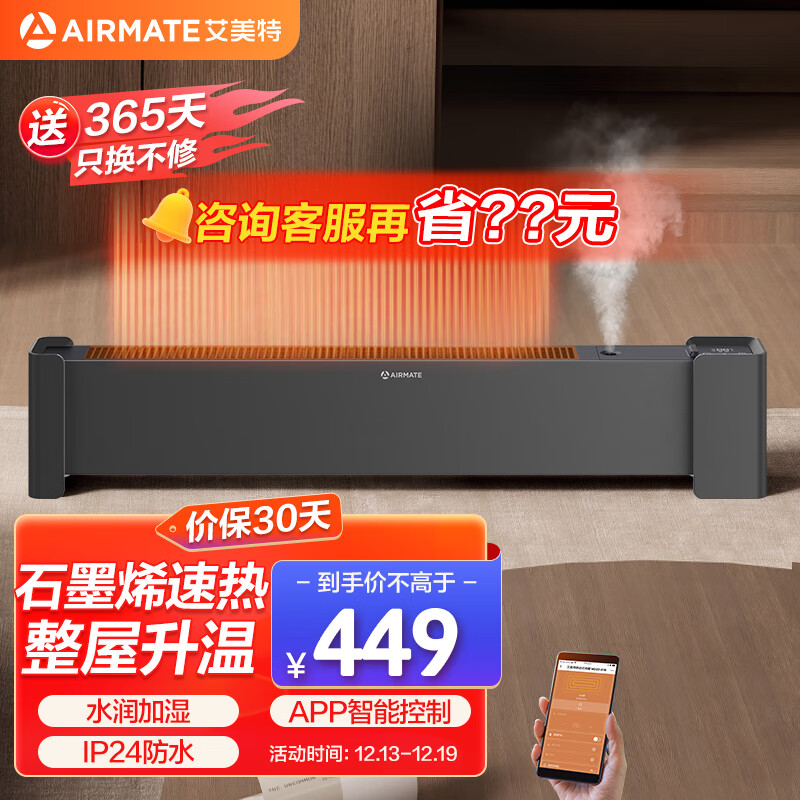 艾美特(AIRMATE)石墨烯取暖器/电暖器/电暖气片家用/暖风机/移动地暖WIFI智能互联加湿防水烤火炉踢脚线 WD22-A18价格:549.00元!