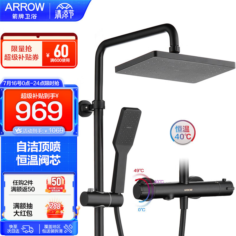 箭牌(ARROW)恒温花洒全套大顶喷洗浴洗澡淋浴喷头升降多功能喷枪莲蓬头套装 雅黑三功能恒温花洒3370HSA价格:1259.00元!