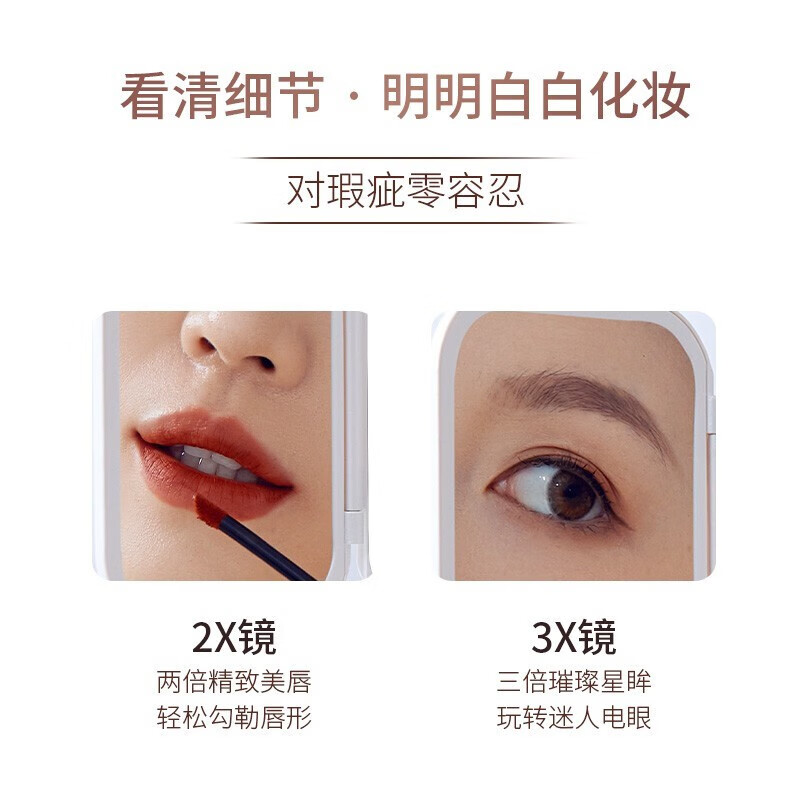 2、镜子很好用,够大够亮,充一次电也能用挺长时间。左右两边也有倍镜,看的也很清楚。能满足基本化妆需要。灯光可以换冷暖色,长按还能调亮度。