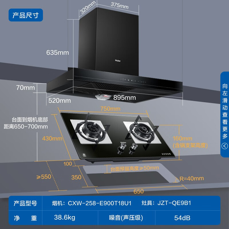 4、海尔的安装和售后100%值得信赖,顶吸的颜值很高,挥手开关也很灵敏,挥手即开,风量吸力大小ai智能感应不需要自己调解。燃气灶还没装,期待后续实际使用效果。安装的很快,师傅也很热情,干活麻利。