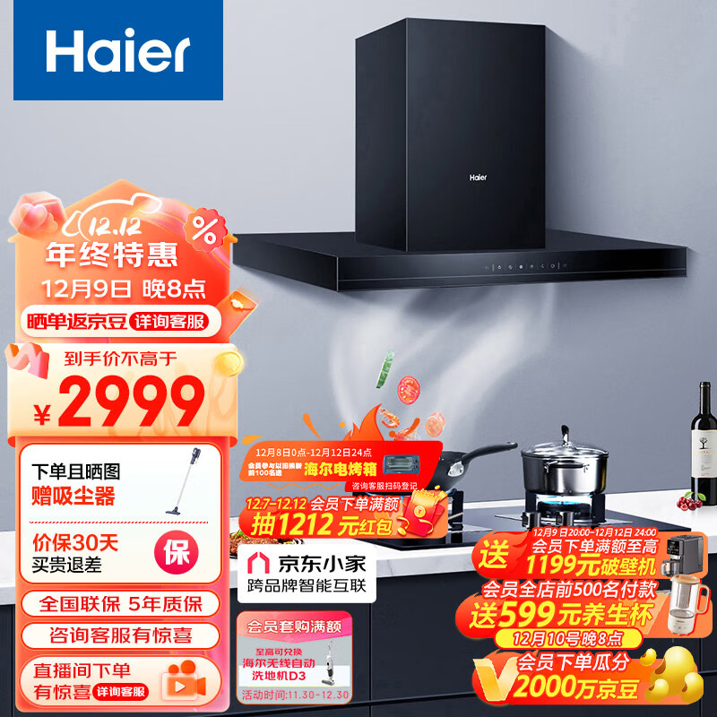 海尔(Haier)抽油烟机 烟灶套装 变频欧式 22m3/min大吸力840pa挥手热熔自清洁灶具套装T18U1+9B1(天)价格:3269.00元!