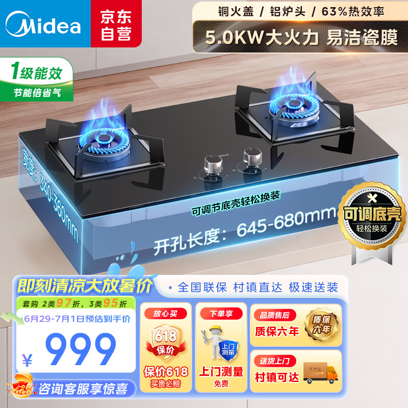 美的(Midea)燃气灶双灶家用5.0KW大火力黑晶宽面板台嵌两用双灶液化气灶Q330价格:999.00元!
