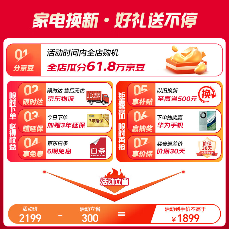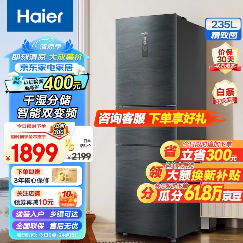 海尔(Haier)235升三门风冷无霜冰箱 智能双变频 一级能效 干湿分储 家用小型节能冰箱 全温区变温冰箱以旧换新价格:2199.00元!
