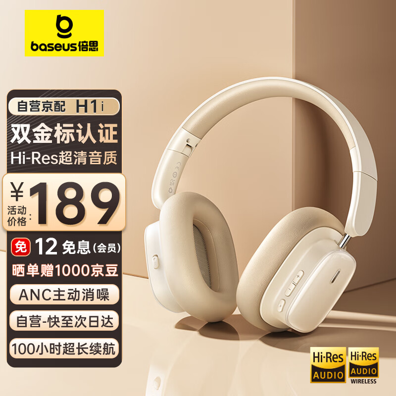 倍思H1i双金标版 头戴式蓝牙耳机真无线主动降噪 100小时超长续航高音质 手机电脑游戏网课适用 白色价格:229.00元!
