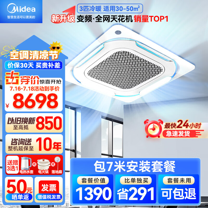 美的(Midea)3匹天花机空调吸顶吊顶空调 商用中央空调嵌入式变频冷暖220V包7米铜管安装RFD-72QW/BDN8Y-D(B3)价格:8698.00元!