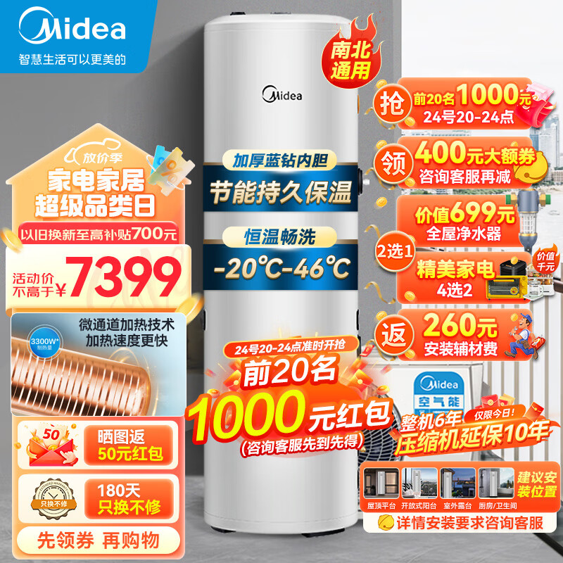 美的(Midea)空气能热水器家用300升电辅加热E+蓝钻内胆水电分离智能WiFi包安装热水王KF109/RD-X2-300-(E3)价格:7499.00元!