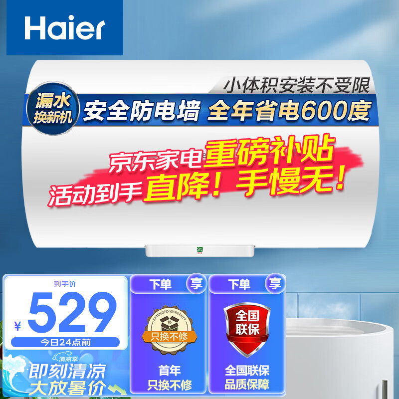 海尔(Haier)40升【安心浴】电热水器2200W高效加热 小尺寸节能金刚三层胆安防不漏水 EC4001-HC3新 以旧换新价格:529.00元!