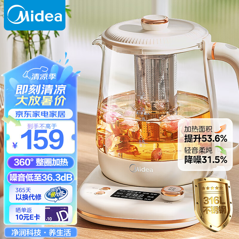 美的(Midea)精粹小气泡养生壶 母婴级316L不锈钢煮茶壶 360°加热 降噪烧水壶 12小时恒温电热水壶YS15P302价格:159.00元!