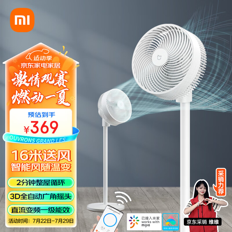 米家小米空气循环扇电风扇落地扇家用 3D自动摇头直流变频轻音节能台地两用温湿智能感应APP100档调节价格:369.00元!