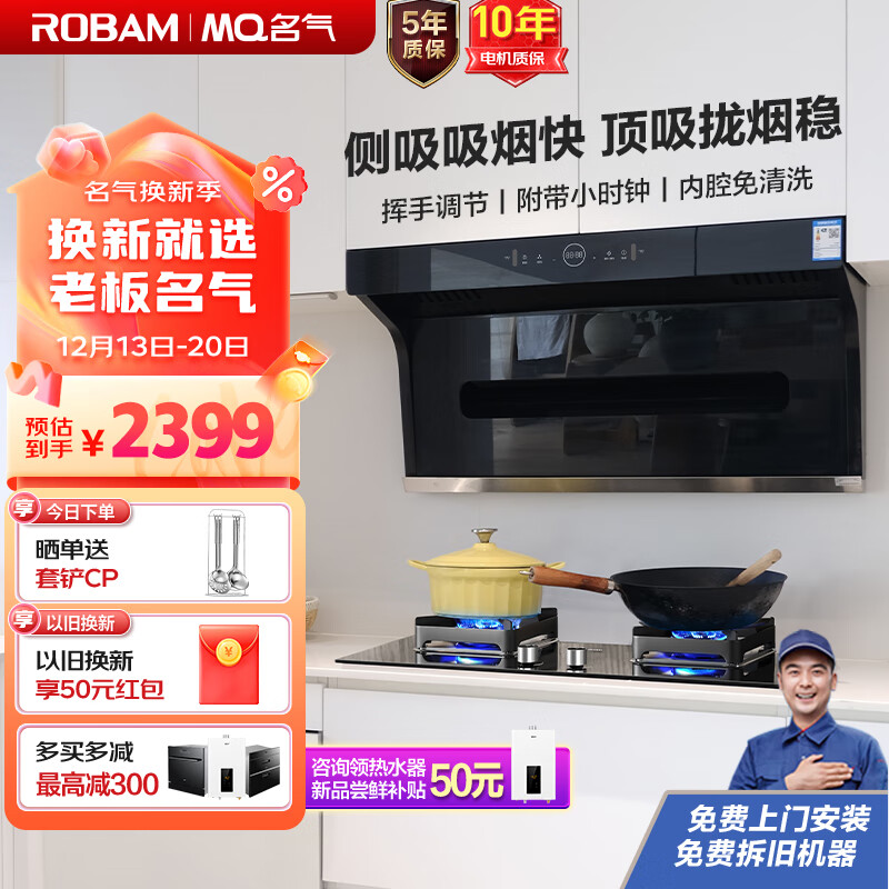 名气(MQ)老板抽油烟机自适应灶具23大吸力家用顶侧双吸烟灶套装天然气A5505+6510BT价格:2399.00元!